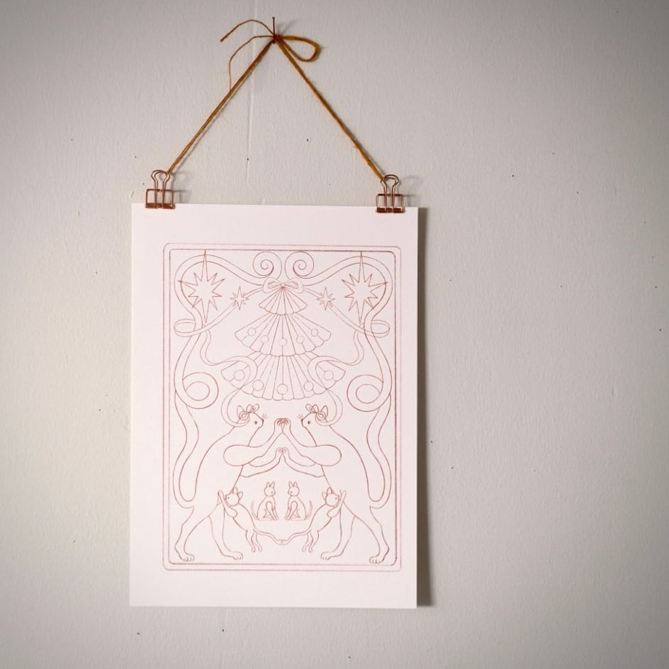 Add charm and storytelling to your walls with this Art Nouveau Cats print, featuring a whimsical symmetrical composition of elegant felines surrounded by flowing ornamental lines and celestial details. The design blends vintage illustration with playful character, making it perfect for cat lovers and Art Nouveau enthusiasts alike.
