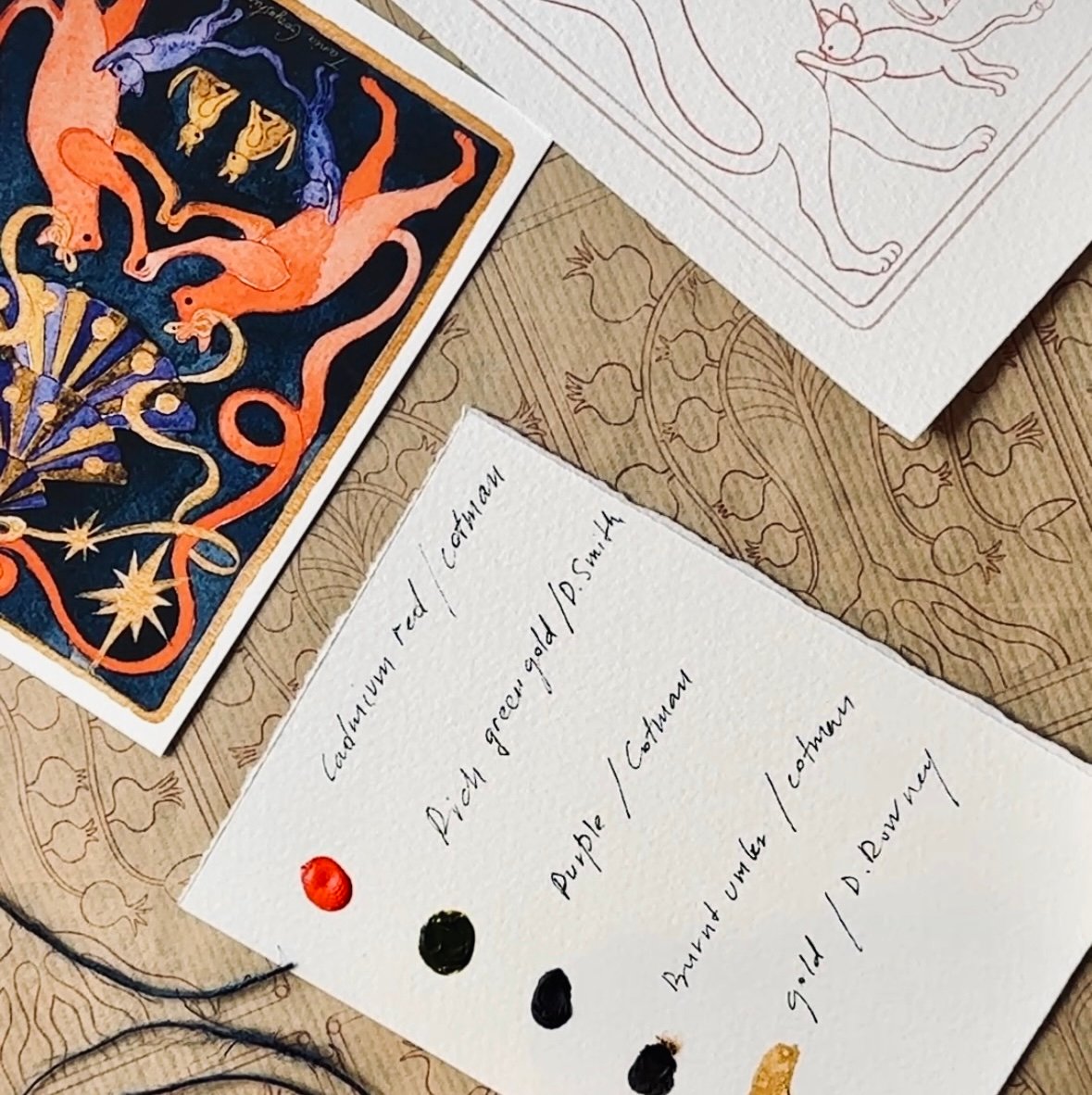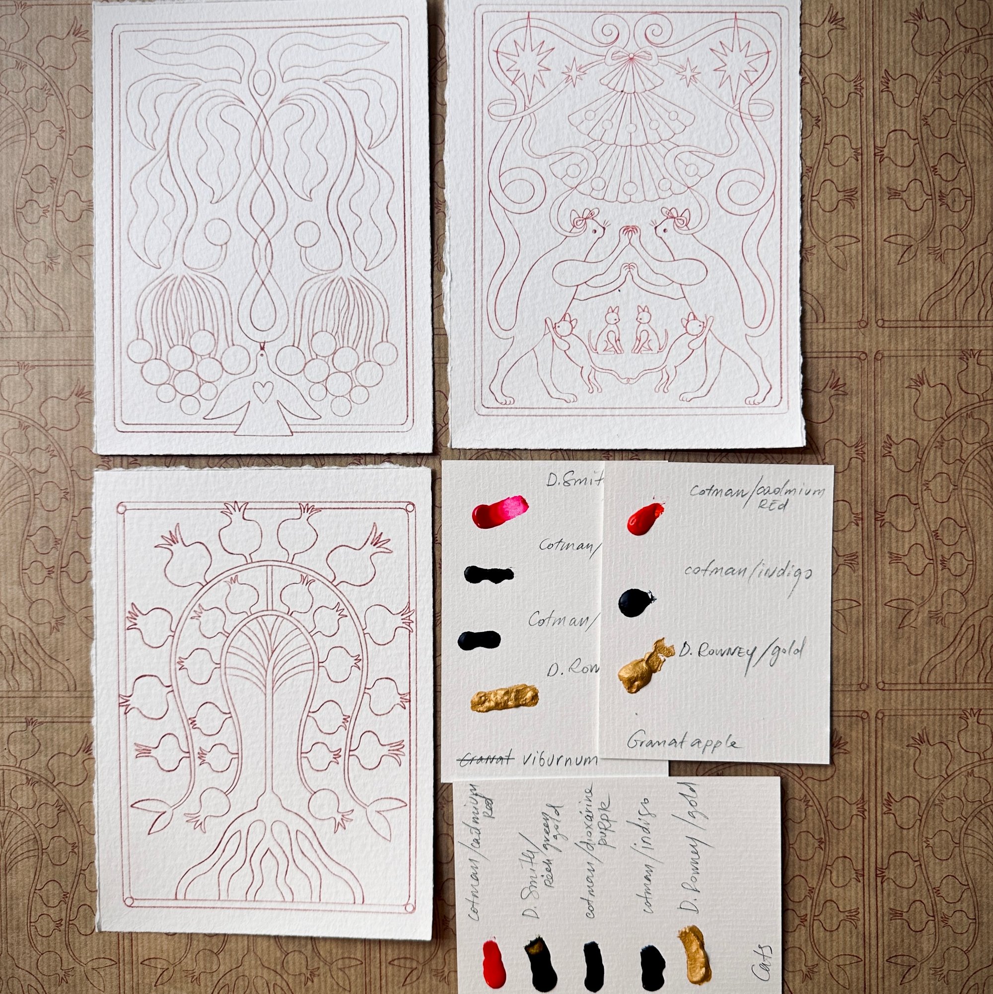 3 × A6 outlines (Granat Apple, Cats, Viburnum) printed on